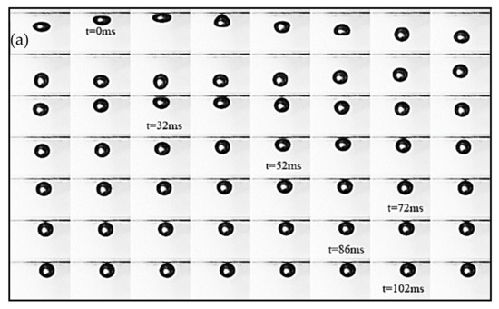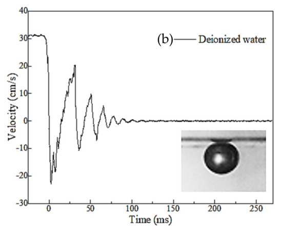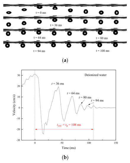 In addition to hydrophilic muscovite, the collision-rebound process of the bubble with the hydrophobic talc was also necessary to be studied. The result in the deionized water is shown in Figure 10a where the interval time between two photos was 4 ms. During the rising movement, the bubble experienced five collision-rebounce processes on the talc surface: t = 0 ms, t = 36 ms, t = 64 ms, t = 80 ms, and t = 94 ms. Similar to muscovite, the time interval in the solution with talc after each collision-rebound also decreased in sequence, indicating that the bubble’s rebound distance also reduced in turn. Finally, the bubble was adhered to the talc surface, and the TPC line formed at t = 108 ms. The velocity consistent with the collision-rebound process was revealed in Figure 10b, from which it can be concluded that the bubble kept colliding and rebounding before it adhered to the talc surface and made the TPC line form, signifying that tD = 0 and = = 108 ms.