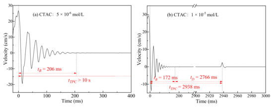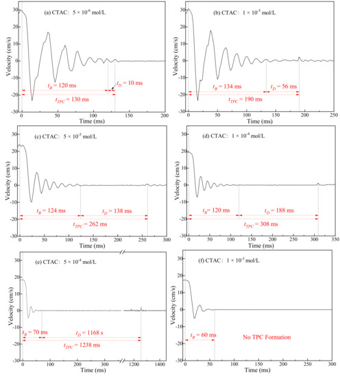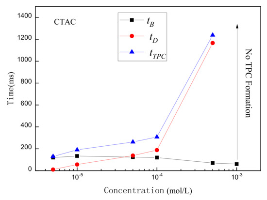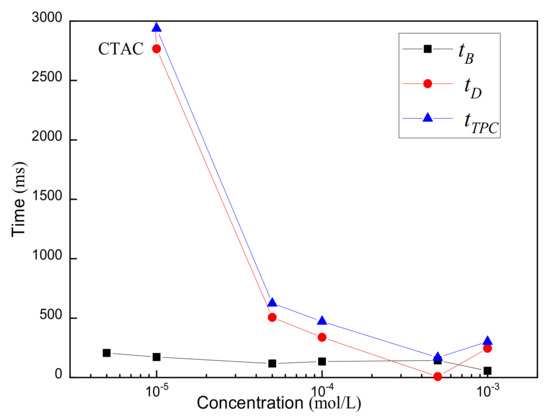 Besides deionized water, the bubble velocity during the collision-rebound process with the talc surface in the CTAC solution with different concentrations was also studied in Figure 11. According to the result, the motion rule with the talc surface was different from that in Figure 7. The higher concentrations resulted in smaller collision-rebound cycles and shorter tB, but longer tD and [30], as shown in Figure 12. This explained that the higher concentration of CTAC could hamper the TPC formation, and even no TPC occurred at 1 × 10−3 mol/L, indicating that the hydrophobicity was not the main reason for TPC formation of hydrophobic talc. This is because there was a local foam film between the bubble and the talc, making the bubble stability become the major reason. For concentrations below 5 × 10−5 mol/L, tB > tD, indicating that the effect of the bubble rebound process on the TPC line was greater than the liquid film burst time. While tB and tD showed opposite changes, tTPC extended with increasing CTAC concentration. Different phenomena between hydrophobic talc and hydrophilic muscovite showed that TPC can be formed due to different reasons.