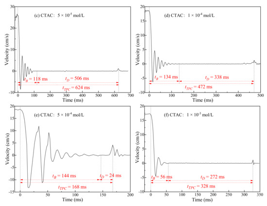 In the cationic CTAC solution, the bubble velocity during the collision-rebound process with the surface was studied in Figure 7. Different from that in water, there was a non-zero velocity after a period of inactivity, indicating that the bubble was adhered on the muscovite surface, and there were TPC lines formed under all concentrations. As shown in the results, the rebound intensity was associated with its concentration. When the concentration was 5 × 10−6 mol/L (Figure 7a), the bubble experienced eight collision-rebound changes, and the velocity sequentially decreased until it no longer varied to be stable. As the concentration ascended, the number of collision-rebound changes become less and less. While at 1 × 10−3 mol/L (Figure 7f), only two changes were found through the whole rising motion. The results showed that the time tB was shortened as the concentration of surfactants increased. This means that the kinetic energy dissipation happened faster in concentrated surfactant solutions. This is principally because the surfactant with high concentration can distribute more evenly on the bubble surface and hinders its fluidity. At this condition, the generated bubble does not move in a short time after the separation with the capillary, and the time tB is shortened finally.