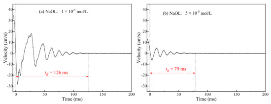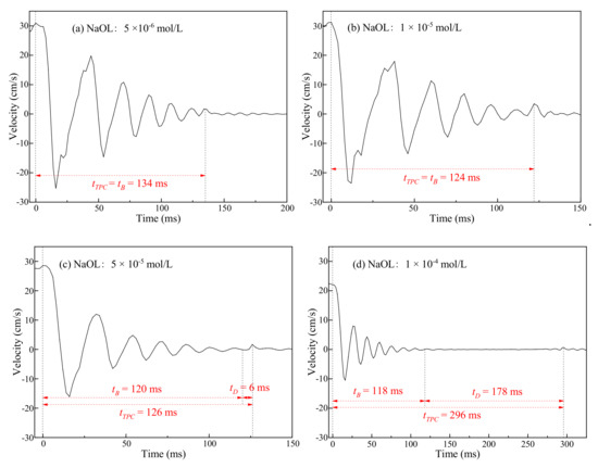 Figure 13 shows the relevant velocity changes for NaOL solution. Unlike muscovite, which had no TPC at all NaOL concentrations, the TPC phenomenon appeared at almost all concentrations on the talc surface, similar to that of the CTAC solution in Figure 11. After the bubble collided with the talc, the rising rate decreased to zero immediately and then rebounded to the solution. When the rebound velocity decreased to zero, the bubble rose up and collided with the talc again. Its kinetic energy was finally exhausted and maintained stably below the talc surface. After a rest period, there was a small positive velocity, indicating that the bubbles adhered to the talc and that the TPC had occurred. When the concentration was lower than 5 × 10−5 mol/L, tD was zero or negligible, making tTPC = tB. The TPC time required for CTAC was slightly longer than that for the same concentration of NaOL. For the anionic surfactant, even though there was electrostatic repulsion between the bubbles and the talc surface, the TPC still can be formed. This further demonstrated that the main reason for TPC formation was different for different minerals.