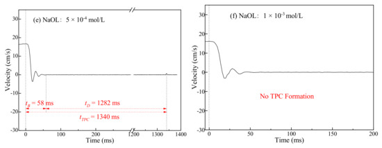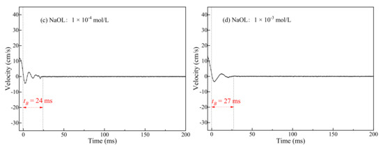 The result of a velocity variation in the anionic NaOL solution was investigated in Figure 9 where there was no TPC line formed at any of the concentrations, as was the case with deionized water. The bubbles were not adhered to the muscovite surface in the NaOL solution. For this reason, the time of TPC and the drainage time were both zero ( = = 0). The increase in concentration made the collision-rebound time cut down from 126 ms to 27 ms, and values in NaOL were smaller than those in CTAC at the same concentration. When the concentration increased from 1 × 10−5 mol/L (Figure 9a) to 1 × 10−3 mol/L (Figure 9d), the number of collision-rebounds reduced from six to one, and the velocity at the same time also tended to drop dramatically. Therefore, the ability to form a TPC line depends on the type of surfactant. In the deionized water and the anionic NaOL solution, no TPC was observed, but in the cationic CTAC surfactant, a TPC line occurred successfully, and the time required was shortened as the concentration increased.