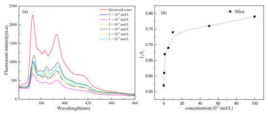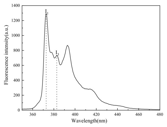 Pyrene was an organic molecule that is slightly soluble in water and can be solubilized in surfactant micelles or surfactants adsorbed on mineral surfaces. Pyrene is usually employed to observe the change in the micro-polarity in suspensions, such as pulp, because there is nearly no fluorescence signal for many flotation reagents, and some indicator substances are then needed to be introduced to facilitate the micro-polarity analysis. Until now, pyrene has been used widely for the adsorption mechanism analysis of flotation reagents [31,32,33]. It can generate a monomer emission spectrum after excitation at a 335 nm wavelength, which was a structure spectrum with five sharp peaks, as shown in Figure 14. The ratio of the intensity of the third peak (I3) to the first peak (I1) could reflect the change in the polarity of its environment [34]. The larger the I3/I1, the weaker the polarity, that is, the more hydrophobic the environment. In the aqueous solution, I3/I1 was about 0.5 ~ 0.6, while in micelles, it was 0.8 ~ 0.9, and it was greater than 1 in non-polar solvents [35]. Therefore, we chose pyrene as a fluorescent probe to detect the surface “micro-polarity” changes in the muscovite and the talc in different concentrations of surfactant solutions.