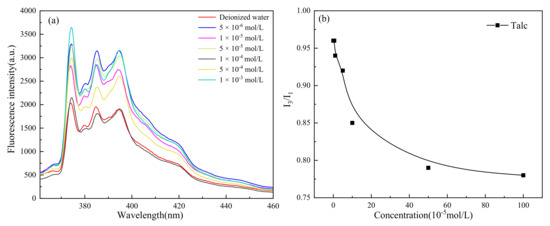 CTAC solutions of different concentrations. (a) Pyrene fluorescence spectra of talc. (b) I3/I1 values of probe pyrene on talc surface.