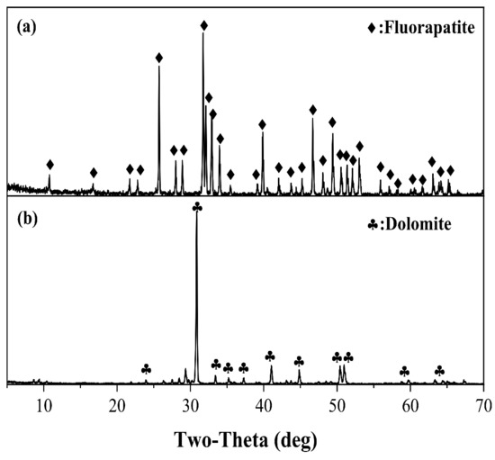 Fluorapatite and dolomite with high purity were purchased from Guangdong and Hubei, China. Firstly, both minerals were broken and powdered carefully, and subsequently wet sieved and dried to generate desired size fraction for further experiments. The size fraction of 38–75 μm was applied for micro-flotation experiments, whereas the −5 μm size fraction samples were used for XPS analyses. The X-ray diffraction patterns and chemical compositions of pure fluorapatite and dolomite are presented in Figure 1 and Table 1 and Table 2. X-ray diffraction (XRD) analysis was performed by a Bruker D8 ADVANCE X-ray diffractometer at a voltage of 40 kV and a current of 40 mA with Cu K radiation []. The chemical compositions were detected by using X-ray fluorescence (Zetium analyzer manufactured by Panalytical B. V company, Netherlands). From the results, it can be inferred that both fluorapatite and dolomite are of high purity as the characteristic peaks belonged to fluorapatite and dolomite are sharp and intensive [], some of the peaks cannot be detected are ascribed to the impurities.