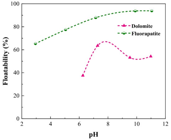 pH is an important factor that affects the forms of chemicals existing in the solution, then changing the performance of the reagents in response [,,]. Dolomite is prone to being dissolved in acidic environment because of the presence of CO32−. Therefore, for dolomite, only alkaline environment has been tested here. As shown in Figure 3 it can be seen that the floatability of fluorapatite grew progressively from 65.33% to 93.86% across the pH range tested. Dolomite, on the other hand, had a lower floatability, with the highest floatability being about 63.57% at pH 7.28. The optimal pH value for flotation was around 9.6, at which point fluorapatite had a floatability of around 93% and dolomite had a floatability of 53.14%. The results demonstrate that when SDBS was applied as a collector, both dolomite and fluorapatite could float. The floatability of fluorapatite was always higher than that of dolomite over the pH range tested, indicating that SDBS showed a higher affinity towards fluorapatite rather than dolomite. Moreover, it should be noted that SDBS still exhibited high collecting ability even at low temperature, demonstrating that it could be employed as the potential alternative for effective fluorapatite recovery in hard area.
