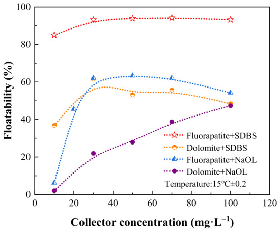 The flotation performance of NaOL and SDBS was evaluated and compared with respect to collector concentration under low temperature and the results are presented in Figure 4. When NaOL was used as collector, the floatability of fluorapatite and dolomite both experienced an upward trend. The floatability of fluorapatite reached its biggest value when the NaOL concentration was 30 mg·L−1, assaying by 62%. A further increase of concentration caused negligible effect on the floatability improvement. The floatability of dolomite under this condition was 27.9%, which was 34.1% lower than that of fluorapatite. The results indicate that NaOL cannot successfully collect fluorapatite under low temperature in terms of the low floatability, it is because the dispersion and activity of NaOL in solution were affected by temperature []. In comparison with NaOL, the floatability of fluorapatite was always above 85% across the concentration tested when SDBS was applied. It should be noted that dolomite could also be collected with a relatively high floatability. It reached its biggest value when the SDBS concentration was 30 mg·L−1, coming to 61.56%, which was 27.54% lower than that of fluorapatite under the same condition. Based on the flotation results, it can be concluded that both SDBS and NaOL showed the collecting ability toward fluorapatite and dolomite, the floatability of fluorapatite was always higher than that of dolomite under the same collector concentration. The difference between SDBS and NaOL was that the former exhibited a stronger performance under low temperature in terms of the higher floatability of fluorapatite and dolomite, indicating that SDBS was more suitable to be used under hard condition.