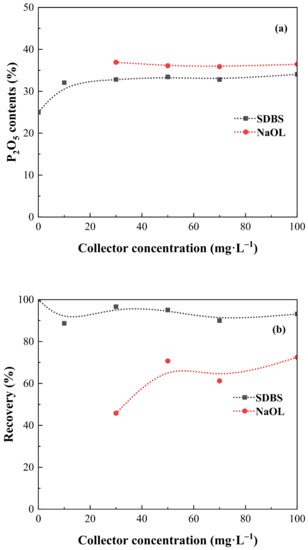 The selectivity of NaOL and SDBS under low temperature was evaluated with the help of artificially mixed minerals flotation, the results are presented in Figure 5a,b. In the presence of NaOL, the P2O5 contents kept stable around 36% without any big change over the concentration tested, indicating that NaOL exhibited an excellent selectivity in fluorapatite-dolomite system. However, the recovery was relatively low when the NaOL concentration was 30 mg·L−1, reaching 45.79%, and further gradually increased to 72.46% when the NaOL concentration was 100 mg·L−1 (Figure 5b). The results indicate that NaOL showed a high selectivity in mixed minerals system, but cannot collect valuable minerals as much as possible because of the limited temperature condition. Moreover, a further improvement of recovery would increase the addition of collector dosage, thereby causing an extra cost. As for SDBS collector, it can be seen that with the increase of collector concentration from 0 to 100 mg·L−1, the P2O5 contents gradually increased from 25% to 34.05% (Figure 5a), the recovery was almost stable around 90% without any big variation (Figure 5b). When the SDBS concentration was 30 mg·L−1, a concentrate with P2O5 contents of 32.8% and recovery of 96.63% could be obtained. The results indicate that SDBS exhibited a good selectivity in fluorapatite-dolomite system and can collect most of the fluorapatite. Moreover, the results obtained from mixed minerals flotation further prove that SDBS showed a high affinity towards fluorapatite rather than dolomite and it can preferred adsorb onto fluorapatite surface when fluorapatite and dolomite coexist. Regarding on the flotation results of SDBS and NaOL, it can be concluded that SDBS is more suitable than NaOL for satisfactory recovery of fluorapatite under low temperature.