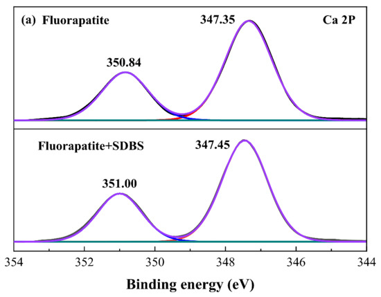 XPS detection is commonly employed to characterize the changes in surface elements of mineral specimens after interaction with flotation chemicals. The mineral sample was analyzed by using a Thermo Scientific ESCALAB 250Xi instrument under 10−9 bar of air pressure [,]. Both dolomite and fluorapatite minerals with size fraction below 5 μm were added into the flotation cell and stirred for 2 min. Then 30 mg·L−1 SDBS collector was added into the pulp, the pH was adjusted to 9.6 with the help of diluted Na2CO3. The solution was then filtered and washed twice using pure water to remove the weak adsorption of collector. The filtered solids were dried in a vacuum drying oven and then analyzed by XPS instrument. The peaks fitting and data analysis were carried out with XPS software Thermo Advantage, and the standard Carbon binding energy was calibrated to 284.80 eV.
