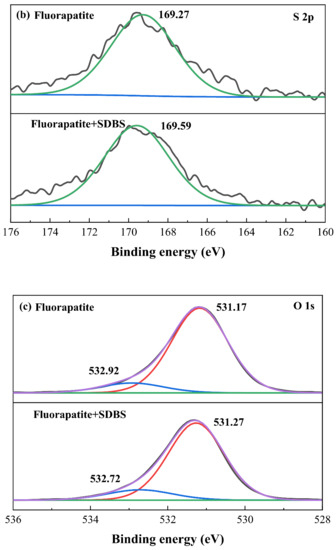 In order to find the detailed adsorption mechanism of SDBS on minerals surfaces, XPS analyses were conducted. The Ca 2p, S 2p and O 1s XPS spectra and the fitting curves of fluorapatite before and after the treatment of SDBS were evaluated. The Ca 2p spectrum for pure fluorapatite contains two peaks of Ca 2p3/2 and Ca 2p1/2 at binding energy locations of 347.35 eV and 350.84 eV, respectively, as shown in Figure 6a []. Since the presence of SDBS affected the density of the electron atmosphere in the Ca atomic perimeter of the fluorapatite surface, the binding energy of Ca 2p shifted to 347.45 eV and 351.00 eV (shifted by 0.2 eV) when it was treated with SDBS. In comparison with other researches [,,], because the absolute value of repulsive potential on fluorapatite surface atoms varied under different chemical conditions, the variations in binding energy of Ca 2p were more noticeable than matching values obtained in this work. As a result, the hydrophobic flotation of fluorapatite may be attributed mostly to the active components RSO3− in the collector interacting with the Ca sites, resulting in the formation of a hydrophobic layer coverage. The peak at 169.27 eV after the addition of SDBS has shifted to 169.58 eV (shifted by 0.31 eV), indicating that SDBS has successfully adsorbed onto fluorapatite surface and the chemical surrounding of S atomic has experienced a large change, which may be attributed to chemical bonding between sulfo group and Ca sites []. As for O 1s, from Figure 6c it can be seen that the O 1s spectrum of fluorapatite after the treatment of SDBS was fitted into two peaks: PO43− (531.27 eV), -O-S=O (532.06 eV). The presence of -O-S=O indicates that chemical adsorption occurred at Ca sites on the fluorapatite surface and the reaction involved the sulfonate species of SDBS. The XPS analyses strongly demonstrate that SDBS showed a high affinity on fluorapatite and the interaction is mainly due the chemical bonding between sulfo groups and Ca sites.