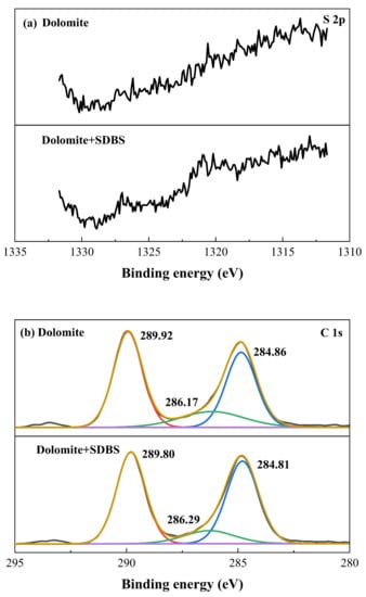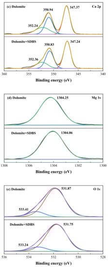 As for dolomite, the S 2p, C 1s, Ca 2p, Mg 1s and O 1s XPS spectra were presented in Figure 7, respectively. From Figure 7a it can be seen that with and without the pretreatment of SDBS, there are no S peaks have been detected on dolomite surface, suggesting that the adsorption of SDBS on dolomite was weak. As depicted in Figure 7b, for untreated dolomite, three well-fitting bands at 284.86 eV, 286.17 eV, and 289.92 eV separated from the C 1s spectrum. The fitted bands at 284.86 eV and 286.17 eV on the dolomite surface were assigned to the adventitious contaminants of hydrocarbon and carbon-oxygen [], while the separated peak at 289.92 eV was derived from the carbon of dolomite itself []. After the dolomite conditioned with SDBS, no significant shift and new peaks occurred, indicating that the chemical environment of carbon element kept stable. The Ca 2p and Mg 1s spectra of dolomite are displayed in Figure 7c,d. The two strong double peaks at 347.37 eV and 350.94 eV were derived from Ca 2p3/2 and Ca 2p1/2 in dolomite, the peak located at 352.24 eV was attributed to Mg KLL Auger due to magnesium element existed in dolomite. The peak of Mg 1s spectrum was located at 1304.25 eV. After the addition of SDBS, the binding energy of both Ca 2p and Mg 1s shifted slightly, indicating that the chemical environment of Ca and Mg on dolomite surface were not affected and there is no chemical bonding between SDBS and Ca, Mg active sites. Moreover, the O 1s peak of bare dolomite was divided into two bands recorded at 531.87 eV and 533.41 eV, which separately belonged to the oxygen element of CO32− in dolomite itself and adventitious carbon oxides (contamination). After the addition of SDBS, the binding energy of these two characteristic peaks shifted slightly, indicating that the weak adsorption of SDBS on dolomite surface. The XPS results of dolomite are in good agreement with the experimental phenomenon that SDBS has a certain collecting ability towards dolomite, but the adsorption is relatively weak compared to that on fluorapatite surface.