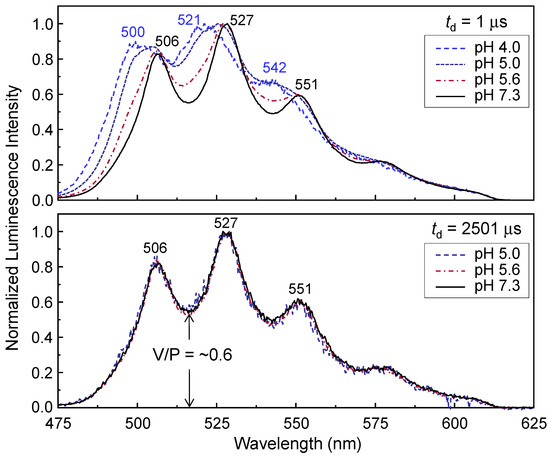 In the lower panel of Figure 1, the spectra acquired at td = 2501 μs can be considered the luminescence of the U(VI)-hydroxo surface species alone because the spectral overlap between these species is eliminated because of the much shorter luminescence lifetime of ≡SiO2UO2, as discussed later in association with spectral decomposition using the luminescence lifetime. To compare the luminescence spectral shapes in more detail, we defined the valley-to-peak (V/P) intensity ratio as the luminescence intensity of the first valley versus the intensity of the strongest peak, designated by an arrow in Figure 1. In the lower panel, there are no significant differences between the V/P intensity ratios measured at various pH values. In addition, the peak wavelengths and spectral shapes remain unchanged for td in the range of 2001–3001 μs. Thus, the spectra measured under the long-td condition were generated by a unique U(VI)-hydroxo surface species. The change in the V/P intensity ratio at various pH values results from the overlap of the luminescence spectra generated by multiple U(VI) species, as shown in the upper panel of Figure 1. An increase in pH leads to a lower V/P intensity ratio. This result is ascribed to the increase in the relative quantity of U(VI)-hydroxo surface species with pH, which shows a highly resolved spectrum at neutral pH values. In Figure S2 of the Supplementary Materials, the luminescence spectra measured for the other high SSA SiO2 (sample No. 2, [U(VI)] = 3.4 μM, m/v = 1.0 g/L) at various pH values show very similar shapes to those displayed in Figure 1.