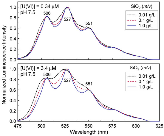 The peak wavelength values are expressed in Arabic numerals in Figure 1. Two U(VI) surface species, ≡SiO2UO2 and ≡SiO2(UO2)OH−, were distinguished based on the representative results obtained from the SiO2 samples at similar conditions of [U(VI)] = 1.0 μM and m/v = 1.0 g/L [17]. In the upper panel, the spectrum acquired at pH 4.0 is completely controlled by ≡SiO2UO2 and the luminescence peaks are located at approximately 500, 521, and 542 nm. The peak maxima are shifted to 506, 527, and 551 nm at pH 7.3. The shift of peak maxima represents the existence of the U(VI)-hydroxo surface species [13,17,18,21,22,23]. The spectra measured under different pH values (pH 5.0 and 5.6) in the upper panel demonstrate the transition of the dominant species from acidic to near-neutral pH conditions.