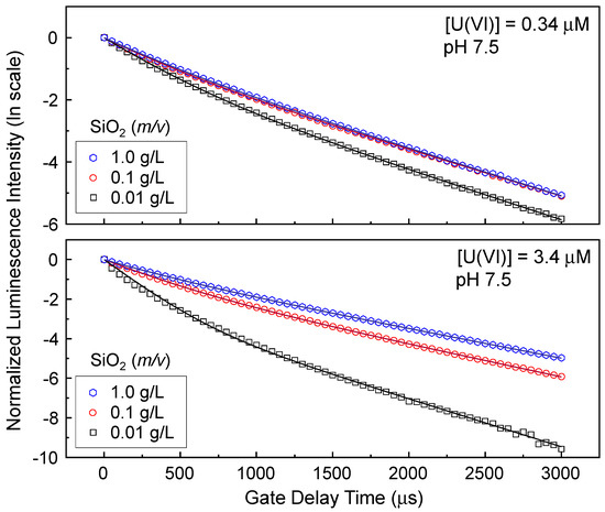 Luminescence lifetimes of U(VI) surface species measured from the samples used to obtain Figure 2. The kinetic mode of the ICCD was utilized with td = 1–3001 μs and a gate delay step of 50 μs. The symbols represent the normalized luminescence intensity on the natural logarithmic scale for U(VI) surface species. The solid lines represent the fitting data calculated using Equation (1).