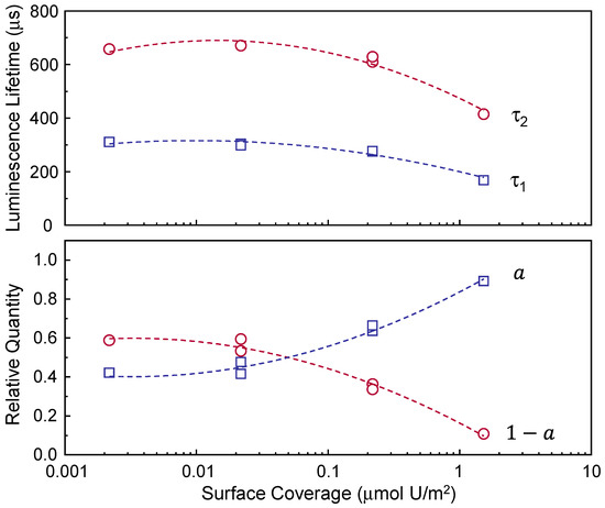 The data listed in Table 2 are plotted as a function of Γ in Figure 4. Interestingly, a change in luminescence lifetime is observed as Γ changes, as shown in the upper panel of Figure 4. τ1 and τ2 change from approximately 170 and 400 μs, respectively, and converge at approximately 310 and 670 μs in the Γ region below 0.01 μmol U/m2. The lower panel of Figure 4 shows the relative quantities of species 1 and 2. The quantity of species 1 ( in Equation (1)) increases with increasing Γ, and vice versa for species 2 ( in Equation (1)).