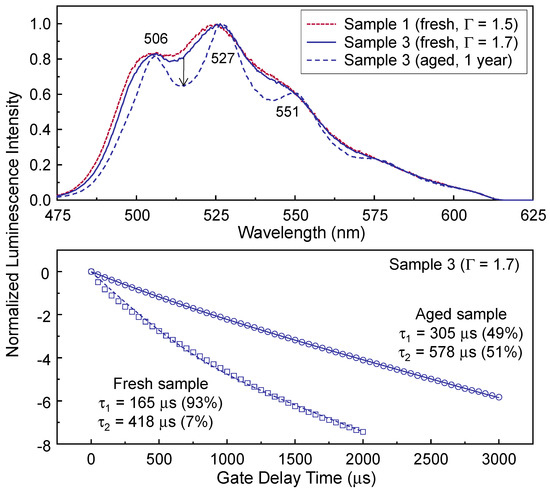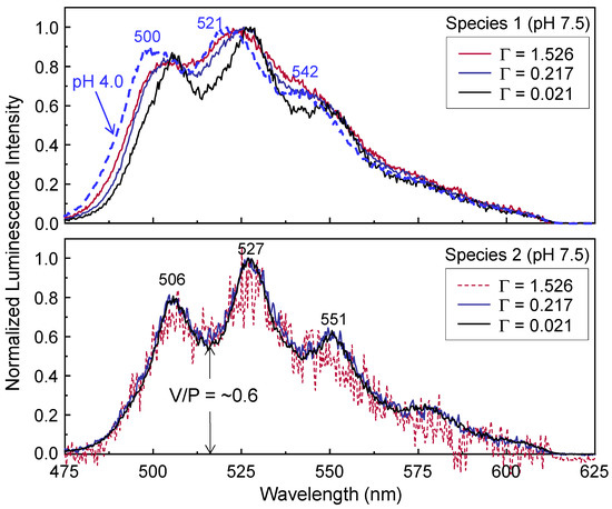 The decomposition results from the three spectra in the lower panel of Figure 2 are presented in Figure 5. The luminescence spectra of species 1 were resolved by subtracting the corrected spectra of species 2 from the corresponding luminescence spectra taken at td = 1 μs [22,41,42]. The corrected spectra of species 2 at td = 1 μs were obtained from the luminescence spectra acquired at td = 2501 μs by compensating for the exponential decay of the luminescence intensity with a lifetime τ2, as listed in Table 2. Different luminescence peak positions in the luminescence spectra of species 1 are observed with changing Γ, depicted as solid lines in the upper panel of Figure 5. The peak positions of species 1 measured at Γ ≈ 1.526 μmol U/m2 are blue-shifted compared to those measured at lower Γ values (Γ ≈ 0.217 and 0.021 μmol U/m2).