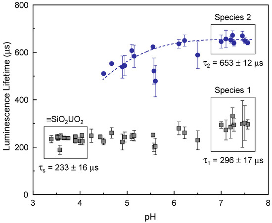 In this regard, it is of interest to examine the pH-dependent luminescence lifetimes of U(VI) surface species with a fixed [U(VI)]/(m/v] ratio because the probability of having two or more deprotonated adjacent sites increases with increasing pH [22]. Figure 6 summarizes the luminescence lifetimes determined from 34 fresh samples (sample No. 1, [m/v] = 1.0 g/L, [U(VI)] = 3.4 μM) under various pH conditions in the range of 3.4–7.6. The luminescence lifetime was determined to be τs = 233 ± 16 μs for the samples in the pH range of 3.4–4.1, where only the luminescence spectra of the ≡SiO2UO2 species appear. The lifetimes of species 1 and 2 were determined to be τ1 = 296 ± 17 μs and τ2 = 653 ± 12 μs, respectively, in the pH range of 7.0–7.6. Although the spectral shapes of species 2 are almost identical, as shown in the lower panel of Figure 1, the luminescence lifetimes vary in the pH range of 4.5–7.6, as depicted by the dashed line in Figure 6, which can be seen even with the naked eye. The lifetime increases from approximately 500 μs near pH 4.5 and converges to a constant value at near-neutral pH. The pH-dependent luminescence lifetimes of U(VI) surface species at a fixed [U]/[m/v] ratio in Figure 6 are in accordance with the Γ-dependent luminescence lifetimes at fixed pH in Figure 4. These observations are major experimental results that can explain the cause of the inconsistent luminescence lifetimes reported in previous studies, irrespective of whether species 2 represents ≡SiO2(UO2)OH− or ≡SiO2(UO2)3(OH)5−. The luminescence lifetimes determined in this study are listed in the last row of Table S1.