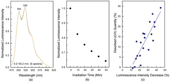 (a) Normalized luminescence spectra of U(VI) surface species for the low SSA sample (sample No. 3, [U(VI)] = 3.4 μM, m/v = 1.0 g/L, pH 7.5). (b) These data show the decrease in the luminescence intensity resulting from the laser-induced reaction at λex = 266 nm. (c) Comparison of the desorbed U(VI) quantity with the decrease in the luminescence intensity for the low SSA samples.