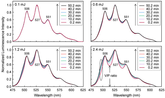 The luminescence spectra of the U(VI) surface species used to derive the data presented in Figure 9 were normalized to the maximum intensity in Figure 10. The initial luminescence spectra, which were measured immediately at 0.2 min after laser irradiation, show almost identical shapes as the same V/P intensity ratio under different laser pulse energies of 0.1–2.4 mJ in Figure 10. The spectral shapes of the U(VI) surface species measured at a laser pulse energy of 0.1 mJ in the left upper panel of Figure 10 do not change with increasing laser irradiation time. Because the measurements were performed for SiO2 samples, which were stored in a globe box for nearly four months, species 2 seems to exist predominantly due to the ageing effect as explained in the previous subsection. Interestingly, the normalized luminescence spectra measured under laser pulse energies of 0.6–2.4 mJ change shapes during laser irradiation. An increase in the laser pulse energy leads to a higher V/P intensity ratio as the irradiation time passes, with the appearance of a shoulder at approximately 497 nm, designated by an ellipse in the right lower panel of Figure 10. The fraction of the shoulder also increases with increasing laser pulse energy. The changes in the luminescence spectral shapes resulting from the laser-induced reaction under laser pulse energies of 0.6–2.4 mJ were ascribed to the appearance of the additional U(VI) species (called ‘species 3’) showing luminescence peaks located at shorter wavelengths. The change in the luminescence intensities of the U(VI) surface species displayed in the upper panel of Figure 9 is very similar to the results observed for the U(VI)-TiO2 system, wherein the photoreduction of U(VI) dominates the laser-induced reaction [34,35]. The formation of non-luminescent U(IV) results in immediate decreases in the luminescence intensities of the U(VI)-TiO2 system. However, the changes in the spectral shapes illustrated in Figure 10 constitute a newly observed phenomenon that has not been reported for the U(VI)-TiO2 system in previous studies [34,35]. This observation indicates that the photoreduction of U(VI) to U(IV) is not the major mechanism of the laser-induced reaction observed for this U(VI)-SiO2 system.