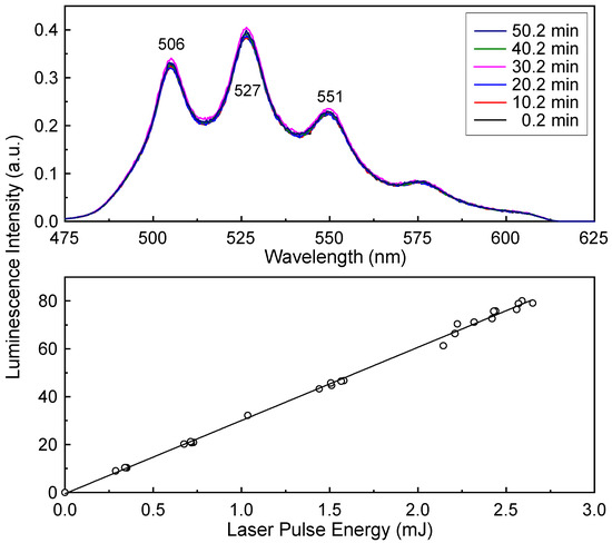 The upper panel of Figure 11 shows the luminescence spectra of the same SiO2 sample used to obtain Figure 9 and Figure 10, measured at λex = 355 nm. The luminescence intensities of these spectra were not normalized. There are no significant changes in either the luminescence intensities or spectral shapes during the laser irradiation even at a laser pulse energy of 2.4 mJ. The lower panel of Figure 11 presents the luminescence intensities as a function of the incident laser pulse energy. Unlike the intensities in Figure 9 measured at λex = 266 nm, the luminescence intensities at λex = 355 nm increase linearly with increasing laser pulse energy. The solid line represents the results of fitting the data to a linear equation.
