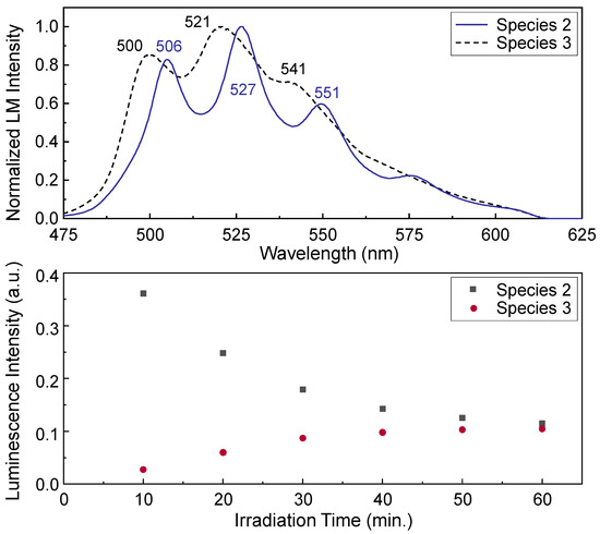The upper panel shows PARAFAC analysis results for decomposition of the luminescence (LM) spectra displayed in the right lower panel of Figure 10. In the lower panel, the luminescence intensities of species 3 gradually increase as the irradiation time passes with decreasing luminescence intensity of species 2.