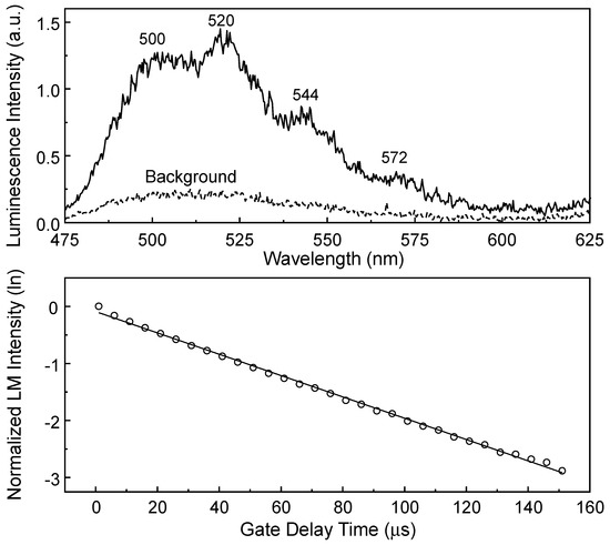 The lower panel of Figure 14 shows the luminescence lifetime measured from the dissolved U(VI) species in the upper panel of Figure 14. The luminescence intensities depicted as symbols were obtained from a series of luminescence spectra measured using the kinetic mode of the ICCD with tw = 10 μs and a td between 1 μs and 151 μs (step size of 5 μs). The symbols and solid lines in the lower panel denote the normalized luminescence intensities on the natural logarithmic scale and the results of fitting the data to a linear regression, respectively. For several filtrates, the luminescence lifetime of the dissolved U(VI) species was determined to be τ = 52 ± 17 μs. The peak wavelengths and luminescence lifetime of the U(VI) species in Figure 14 are comparable to previously reported values (peak wavelengths of 500, 521, 544, and 570 nm and a lifetime of 19 ± 4 μs) at pH 3.9 for the complex in the U(VI)-silicate system, such as the UO2OSi(OH)3+ species [16].