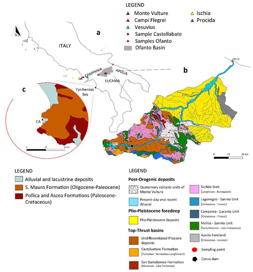 (a) Location of the Ofanto Basin and sampling points. The position of the main volcanoes of the area is also shown; (b) Geological map of the Ofanto Basin (modified after [10]). The position of the sampling points and the Conza dam is also shown; (c) Geological map of the area of Castellabate (modified after [12]).