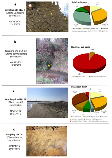 (a) Left: coordinates and picture of sampling site OFA-3. The yellow arrows indicate accumulation of dark minerals; right: percentages of the lithologies drained by the Ofanto River in the sub-basin feeding this sampling site (modified after [8]); (b) left: coordinates and picture of sampling site OFA-13bis. The yellow star indicates the site along the small tributary where the sample was picked up; right: percentages of the lithologies drained by the tributary in the sub-basin feeding this sampling site (modified after [8]); (c) left: coordinates and picture of the Ofanto mouth and the beach of Margherita di Savoia (sampling site OFA-22). Accumulations of dark minerals (sample 22b) are clearly visible on the beach. Right: percentages of the lithologies drained by the Ofanto River in the whole basin (modified after [8]); (d) coordinates and picture of sampling site CA on the beach of Castellabate (Cilento Tyrrhenian coast).