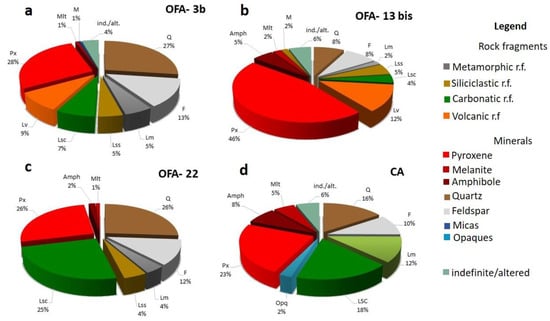 In Figure 4, some photomicrographs on thin sections show the petrographic features of the analyzed sand samples. In Table 2 and Figure 5, the modal compositions of the analyzed samples are shown. Heavy-phases loose crystals are an important component of all the analyzed samples. They are represented by light-colored-to-green clinopyroxene and less abundant amphibole and garnet. The latter always has a light-to-dark-brown color, which allows us to identify it as melanite, a common accessory mineral in the alkaline volcanic rocks of Monte Vulture and Vesuvius [18,37]. Quartz commonly occurs in all the samples in coarse-grained sedimentary or metamorphic rock fragments or as a single grain. Additionally, in the latter case, however, it has been considered non-volcanic in origin, because it is not present as a mineral phase in the rocks of Southern Italy volcanoes. Feldspars are represented by orthoclase and minor microcline, while plagioclase is rare. Micas are always subordinate. Siliciclastic, carbonate, metamorphic and volcanic rock fragments with different textures occur in variable amounts in the four samples. In the sand fraction of the sample picked up in the upstream sector (OFA-3b), all the grains have rather sharp edges (Figure 4a). The most abundant components are represented by quartz and clinopyroxene single crystals, followed by feldspar (mainly represented by orthoclase and microcline and subordinately by plagioclase) (Figure 5a). Clinopyroxene ranges from colorless to green, sometimes with obvious zoning (Figure 4b). Minor amounts of light-brown melanite garnet, amphibole and micas as single crystals also occur. Rock fragments also occur and include clasts of volcanic origin, mainly with microlithic or lathwork texture, carbonate clasts, siliciclastic sedimentary fragments and metamorphic rocks.