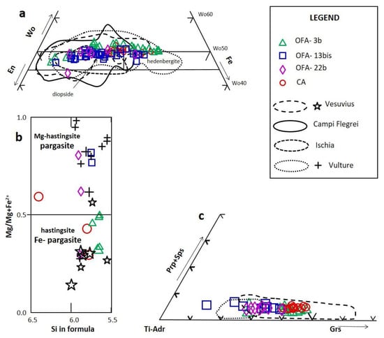 Composition of volcanic heavy minerals in the Ofanto River and Cilento sands. (a): Pyroxene composition. Compositional fields of clinopyroxene from Vulture (data from [18,19,20,39,40,41]), Vesuvius (data selected from [37,42]), Ischia (data from [43]) and Campi Flegrei (data from [44,45,46,47,48,49,50,51,52,53]) are shown for comparison; (b) amphibole (after [38]). Data of amphiboles from Vulture (from [18,20,40]) and Vesuvius (from [42]) are also shown for comparison. Smaller symbols indicate crystals with AlVI < Fe3+ (Mg-hastingsite and hastingsite), bigger symbols indicate crystals with AlVI < Fe3+ (pargasite and Fe-pargasite); (c) garnet. Compositional fields of garnet from Vulture (data from [18,20,54]) and Vesuvius (data from [42,55,56]) are also shown for comparison.