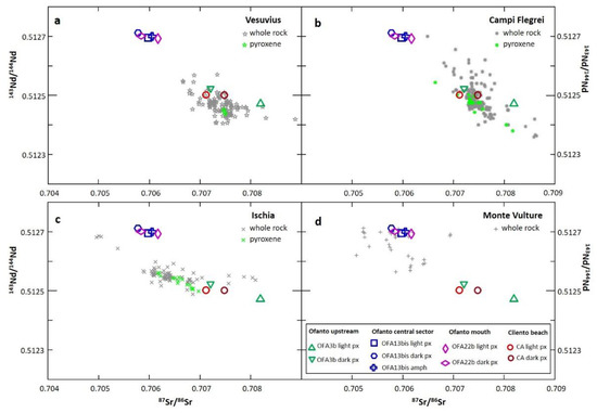 Nd-Sr isotopic composition of the pyroxenes of the studied samples compared to: (a) Vesuvius whole-rock and pyroxene (data from [58,59,60,61,62,63,64]); (b) Campi Flegrei whole-rock and pyroxene (data from [46,53,65,66,67,68,69,70,71,72,73]); (c) Ischia whole-rock and pyroxene (data from [51,61,65,67,74,75,76,77,78]); (d) Monte Vulture whole-rock (data from [75,79,80,81,82]).