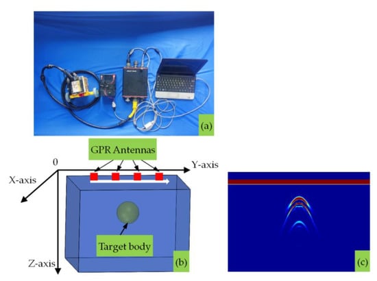 Schematic diagram of GPR detection and imaging. (a) Components of GPR instruments; (b) detection process of underground target body; (c) GPR profile of a survey line.