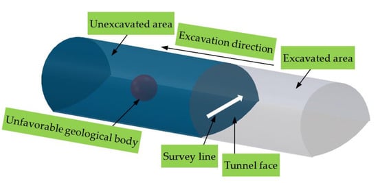 The characteristics of karst development are complex, and karsts have different sizes and shapes. Although a ground survey (or borehole survey) along the tunnel axis can provide rough information for the engineering area before tunnel construction, the forecast is insufficient to infer some sudden changes caused by complex terrain, geology, surface vegetation coverage, and other factors in karst areas [15,16,17]. In addition, karst caves, underground rivers, faults, joint fissures, and water-bearing structures ahead of the tunnel face are concealing, sudden, and destructive [18,19,20]. If the geological situations ahead of the tunnel face are not detected before excavation, blind excavation may cause great disturbance to some unstable rocks and even result in other serious geological disasters, such as water and mud inrush [21,22,23]. During the construction process, the longer the exposure time of the tunnel excavation surface, the more serious the rock mass is wetted by groundwater, which reduces the self-stabilizing ability of the rock mass. In addition, the non-standard construction of the tunnel results in the existence of voids behind the tunnel lining. The above situation will more easily result in the deformation and cracking of the tunnel lining structure, and in severe cases, the tunnel vault will collapse. For example, large-scale water and mud inrush occurred more than 70 times during the construction of Yuanliangshan Tunnel in China. The influx of water and mud flooded the tunnel and interrupted the construction process, causing serious loss of equipment and casualties onsite [24]. During the construction of Qinghan Tunnel in Japan, water and mud bursts occurred many times, causing more than 1300 injuries and 30 deaths. The completion period was 10 years later than originally planned [14]. The Sol-an Tunnel, the longest railway tunnel in a karst terrain in South Korea, also suffered multiple water and mud bursts in the tunnel construction, resulting in severe deformation of the supporting structure and surface subsidence [25]. Therefore, the type and scale of the unfavorable geological condition ahead of the tunnel face should be identified to ensure economy, safety, and efficiency during tunnel construction and take actions accordingly.