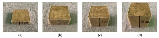 An indoor model experiment is one of the most intuitive and reliable research methods. In the model experiment of void fillers, the model size and material are primary elements that affect the results of model experiment. The similarity ratio of the model size should be controlled within 15 to 30 where possible. On the basis of the dimension of tunnel caves, namely, small caves (height less than 1.5 m), medium caves (height from 1.5 m to 3 m), and large caves (height more than 3 m), the size of the simulated karst cave is set from 5 cm to 20 cm; four different heights, 5, 10, 15, and 20 cm, are considered; and the length and width are 20 cm. A large amount of yellow mud, wet sand, and other filling media are poured into the tunnel karst caves for real application. In this experiment, empty boxes of different sizes are filled with 25% moisture content of loess mixture, which is used to simulate void fillers. Figure 3 shows the physical drawings of void fillers with different sizes.