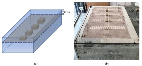 Indoor experiment of GPR detection: (a) schematic diagram of four model boxes buried in the sand box; (b) fifteen survey lines arranged during GPR testing.