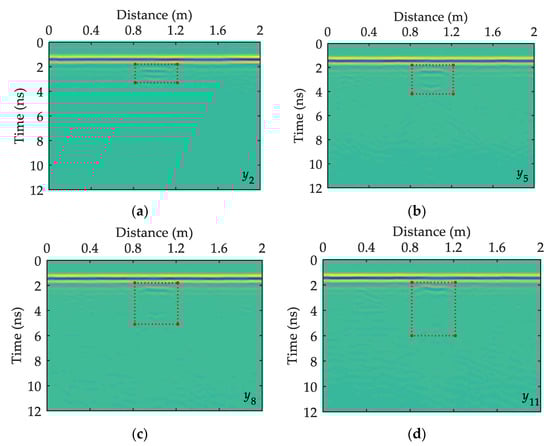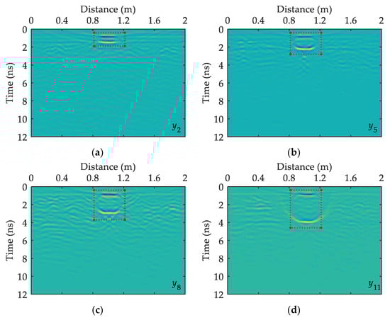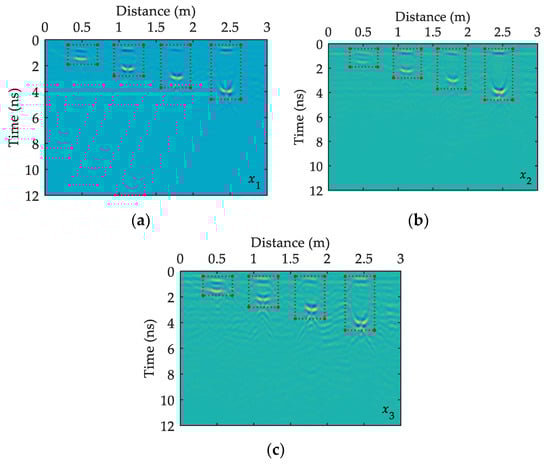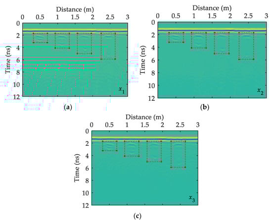 The detection depth of GPR is generally related to the antenna frequency. The lower the frequency of the GPR receiving-transmitting antenna, the greater the detection depth and the lower the resolution; otherwise, the shallower the detection depth, the higher the resolution. Given that the height of the model box is 5, 10, 15, and 20 cm and from previous research experience, a shielded GPR antenna with 1600 MHz center frequency can be used to collect signals. The Ground Probing Radar Systems produced by Ingegneria Dei Sistemi, Italy is selected in the experiment, and each signal collects 384 data points within a 15 ns sampling time window. Considering that the specific position of void fillers in the sand box is obtained, during the detection process, the signals start to be collected from the sand box boundary at least 0.5 m to reduce the impact of boundary conditions on the GPR profile. In the horizontal sampling process, a signal is collected every 1 cm; 300 signals are collected in the longitudinal directions , , and ; and 200 signals are collected in the horizontal directions , , …, . Only three longitudinal survey lines and four horizontal survey lines are listed in this paper in consideration of the space limitations. The results are separately shown in Figure 5 and Figure 6. Among them, the red dotted line boxes represent the location of the target body on the GPR time profile. The horizontal direction is the true distance along the GPR survey line in meters; the vertical direction is the two-way travel time of GPR, measured in nanoseconds.
