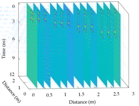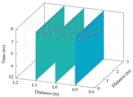 Figure 9 and Figure 10 show that the approximate locations and geometric sizes of void fillers in the sand box are inaccurate. Particularly, when the electromagnetic waves encounter void fillers and are then reflected, it is unclear whether the specific location of the reflection is a crest or a trough. The single-channel signal on every survey line reflects the waveform characteristics of void fillers. The single-channel signals of void fillers should be further analyzed to evaluate the precise position and relative error of void fillers in detail.