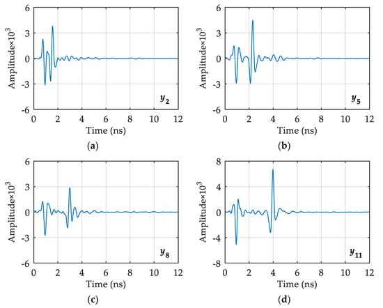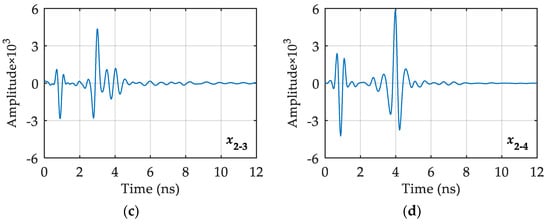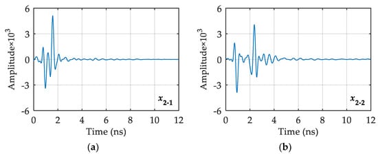 In consideration of the space limitations in this paper, the longitudinal x2 line and the horizontal , , , and lines are used as examples for explanation. The typical single-channel signals reflecting the characteristics of void fillers are extracted from the GPR profile on the longitudinal survey line and the horizontal survey lines , , , and . The results are shown in Figure 11 and Figure 12.