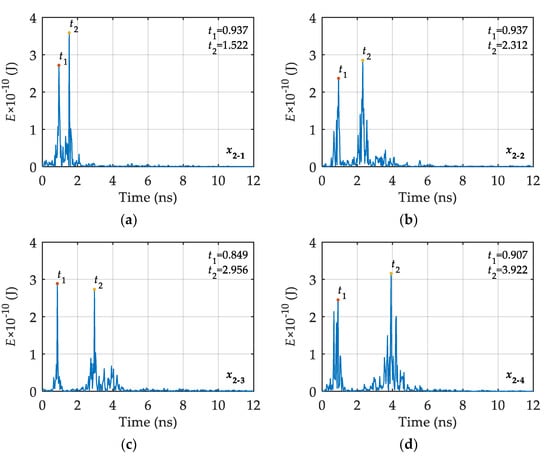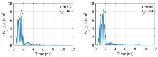 Figure 11 and Figure 12 show that the longitudinal and horizontal single-channel signals have a similar attenuation rule on the time axis. The GPR reflection signals of the upper and lower interfaces of the large void filler are clearly separated, while the GPR reflection signals of the upper and lower interfaces of the small void filler are superimposed on each other. That is, as the size of the void filler increases, the GPR reflection signals of the upper and lower interfaces of the void fillers are more clearly separated. Therefore, a single-channel signal can be used as an example for analysis. The biorthogonal wavelet basis constructed above is used as the wavelet basis for wavelet transform. The time-energy density analysis program for wavelet transform is written in MATLAB, and then the different single-channel signals are analyzed using the TEDAWT method. The results are shown in Figure 13 and Figure 14.
