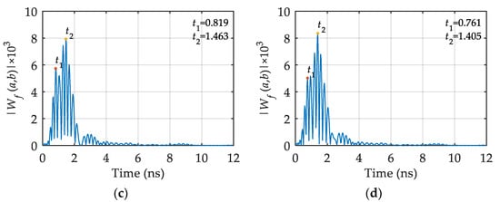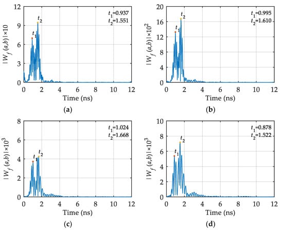 The db5 wavelet basis is employed to perform wavelet transform on the GPR signal on the survey line , , , and , and the modulus curves of wavelet transform coefficient are obtained. The results are shown in Figure 16. Comparing the modulus curves in Figure 16 with the modulus curves in Figure 14, the resolution of the modulus curves obtained by using the db5 wavelet basis is relatively poor; thus, it is difficult to distinguish the first local point in the modulus curves with the second local point (such as Figure 16c,d), which is not beneficial to automatically identify feature points in the modulus curve.