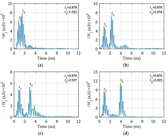 Extensive analysis and research show that the characteristics of wavelet bases of the Daubechies series are good, compact, and supportive and show regularity and smoothness; thus, they are widely used in GPR signal analysis and processing. The following uses db2, db4, db6, and db8 wavelet bases to perform wavelet transform on the same signal to obtain the modulus curves of wavelet transform coefficients. The results are shown in Figure 15. It can be observed from Figure 15 that, by using different wavelet bases to analyze the same GPR signal, the modulus curves of wavelet transform coefficients obtained are not exactly the same. The time of the first local maximum point is 0.819, 0.907, 0.819, and 0.761, respectively. The main reason is that different wavelet bases have different time-frequency localization characteristics. By comparing and analyzing the modulus curves of Figure 14a and Figure 15, it was observed that the resolution of the modulus curve obtained by using the Daubechies series wavelet bases is poor, and it is difficult to accurately obtain the two modulus maximum points of a GPR signal.