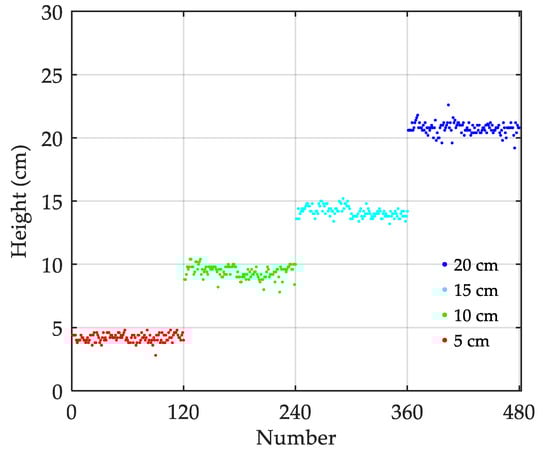 Figure 18 shows that the identified height values of void fillers fluctuate by approximately 5, 10, 15, and 20 cm, with average values of 4.20, 9.42, 14.17, and 20.79 and variances of 0.11, 0.24, 0.18, and 0.21, respectively. The identification errors of void fillers are −16.09%, −5.79%, −5.54%, and 3.94%. With a continuous increase in the size of the void filler, the identification error is smaller, thus indicating the accuracy of the method proposed in this paper is higher. The extremum points obtained from the first and second interfaces of different void fillers are connected, and the results are plotted in Figure 19.