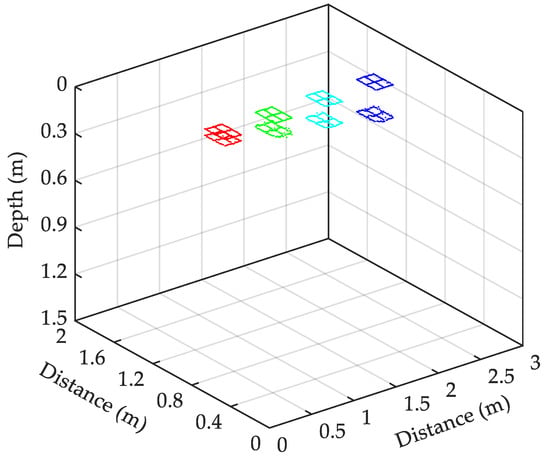 For easy understanding, the horizontal direction is set to the x-axis, the y-axis is perpendicular to the x-axis, and the z-axis is vertically downward. The four model boxes are buried along the y-axis direction every 0.6 m from low to high, with a depth of 10 cm in the sand box. The GPR antenna passes over the model box and marks each detection situation when gathering data. Three longitudinal survey lines, which are denoted as , , and , are arranged perpendicularly to the x-axis to describe the three-dimensional size information of void fillers; is arranged along the center of the model box; and and are along the model box’s edge layout. Twelve horizontal survey lines are arranged perpendicularly to the y-axis, followed by , , …, , and the GPR tests of four model boxes in the laboratory are shown in Figure 4.
