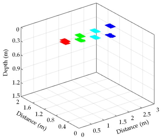 Figure 19 shows that the positions and geometric sizes of void fillers can be obtained on the basis of the relative position of each survey line passing through the void fillers and the height value between the first and second interfaces. Subsequently, connecting the characteristic value points of each filling with a curved surface forms a three-dimensional curved surface diagram. The results are shown in Figure 20, from which the specific positions and geometric sizes of each filling are obtained. Therefore, the TEDAWT method can successfully identify the positions of the first and second interfaces of void fillers at the singular point of GPR signals and then accurately reveal the spatial position and three-dimensional geometry of void fillers in the sand box. It provides a basis for the quantitative identification of unfavorable geological bodies in the advanced geological prediction of tunnels, which is of great significance to the safe and efficient operation of engineering projects.