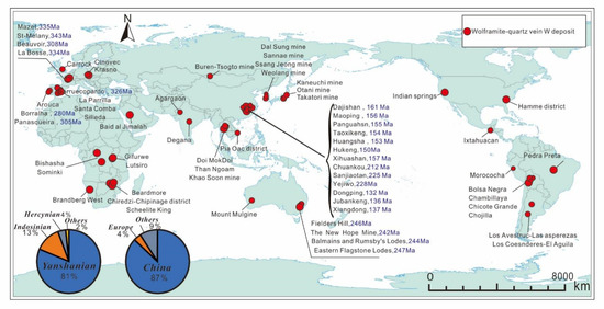 Wolframite-quartz vein-type tungsten deposits, generally related to granitic intrusions, are the source of much of the tungsten used by humans [1,2,3,4,5,6,7,8]. Mineralization of these deposits generally consists of wolframite (dominantly FeWO4 or MnWO4) in subhorizontal centimeter- to meter-scale quartz veins with lateral extents of hundreds of meters. The significant advantages of this type of tungsten deposit other than scheelite skarn are not only that it is easier for mining, but also due to the specialty of wolframite, which are more amenable to mineral processing [9]. In China, the exploitation of wolframite-quartz veins can be traced back to the Song Dynasty. However, the early mining activities were restricted to the utilization of quartz and cassiterite, which are common by-products of wolframite-quartz veins. Large-scale mining activities of wolframite-quartz veins began to break out around the beginning of last century. For example, wolframite in South China was first found in the Xihuashan tungsten deposit, and its mining and utilization officially took place in 1907. Panasqueira, which is located in Portugal, is the second largest tungsten mine in Europe and has been active for ca. 130 years with a total production of 76,000 metric tons of W since 1934 [8]. Because of its important economic significance, a significant number of studies on the fluid processes of wolframite-quartz vein-type W deposits have been carried out all over the world [4,5,10,11,12,13,14,15,16,17,18,19,20,21]. However, preliminary reviews on their global distribution, fluid processes and metallogenic mechanism are relatively scarce.
