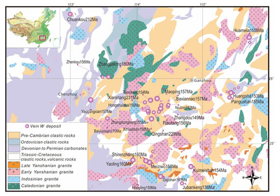 The Nanling region is located in the central part of Southeast China. Within an area of about 160,000 km2, the region contains several giant wolframite-quartz vein-type tungsten deposits and intense granitoid magmatism (Figure 2). The stratigraphy exposed in the Nanling region mainly includes Precambrian-Ordovician clastic rocks, Devonian-Permian carbonates, and Triassic-Cretaceous pyroclastic rocks. The strata dominated by clastic rocks are mainly distributed in the middle and east of the Nanling region, corresponding to the concentrated distribution of wolframite-quartz vein tungsten deposits (Figure 2). Multiple-aged granitoid magmatism formed from the Caledonian to the Cretaceous are accompanied by syngenetic quartz vein-type tungsten mineralization of different degrees of economic significance, of which the worthiest to be proposed are those that occurred in the Triassic and Jurassic periods [57,61,83,86,87]. In the Triassic period (220~200 Ma), the tectonic setting of South China underwent post-collisional extension. The vein-type tungsten deposits formed at this time period were generally related to peraluminous granite magma triggered by crustal heating [9,88,89]. The Triassic wolframite-quartz vein-type deposits were previously believed to be of less economic significance due to their relatively rarer occurrences and smaller scales. In recent years, however, numerous geological research studies and exploration works have been carried out on Triassic W (-Sn) metallogenic events in South China. Liu et al. (2008) [63] reported a mica Ar-Ar age of 231.4 ± 2.4 Ma for the Xianetang tungsten deposit in southern Jiangxi Province. Subsequently, Li et al. (2021) [87] reported a wolframite Re-Os age of 225.5 ± 3.6 Ma for the Chuankou tungsten deposit in south Hunan province, which provides evidence for the existence of large-scale Indosinian quartz vein-type tungsten mineralization in the Nanling region. Although mineralization occurred occasionally from the Caledonian to the Indosinian, the most intensive emplacement of granite and the formation of cogenetic wolframite-quartz vein-type tungsten deposits peaked in South China during the Yanshanian movement (Figure 2).