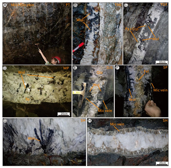 Representative quartz veins from tungsten deposits in South China. (A) Thin wolframite–quartz vein in the Piaotang tungsten deposit. (B) Quartz vein hosted in slate from the Taoxikeng tungsten deposits. (C) Pyrite and chalcopyrite coexisting with wolframite in the Yaogangxian tungsten deposit. (D) Euhedral wolframite grain occurring in topaz from the Maoping tungsten deposit. (E) Wolframite occurring at the point of contact between quartz vein and wall-rock from the Dajishan tungsten deposit. (F) Feldspar vein hosted in the central of quartz vein from the Shangping tungsten deposit. (G) Morphology of wolframite crystals from the Shanhu tungsten deposit. (H) Quartz veins with muscovite envelopes hosted in metapelitic sandstone from the Shanhu tungsten deposit. Abbreviations: Mic—Mica; Qtz—Quartz; Py—Pyrite; To—Topaz; Ccp—Chalcopyrite; Wol—Wolframite; Fel—Feldspar.