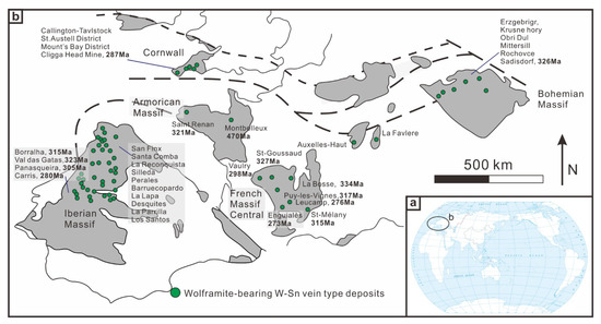 Simplified map showing the framework of W-Sn mineralization provinces in the Variscan belt, compiled based on the mineralization ages of selected deposits described in Table 1 (modified after [80]). Location of the European Variscan belt (a) and major occurrences of W-Sn deposit (b).