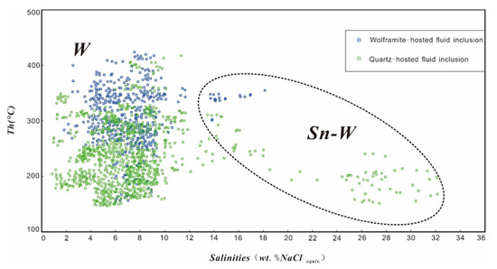 To further identify the fluid properties forming wolframite and quartz, published fluid inclusion salinity and homogenization temperature data from wolframite-quartz vein-type tungsten deposits worldwide were summarized (Figure 5). The dataset shows that the homogenization temperature of wolframite-hosted fluid inclusion is in the range of 250~400 °C, while that of quartz is 150~350 °C (Table 2). The salinities of wolframite and quartz-hosted fluid inclusions are generally in the same range between approximately 2 and 10 wt % NaCl equiv. It is worth noting that in those quartz vein-type deposits, which are dominated by tin, fluid inclusions containing halite daughter minerals are frequently identified, resulting in a significant increase in fluid salinity (Figure 5). In addition, the results show that wolframite and quartz have obvious overlapping areas in terms of salinity vs. homogenization temperature (Figure 5). These results may imply that the crystallization of a portion of quartz and wolframite can occur in identical fluid stages. This conclusion is also supported by mineral sequences from field observations. It is found that there are not only wolframite crystals distributed in the edge, but also some wolframite crystals growing in the middle of quartz veins. This probably implies that wolframite at the edge of the vein crystalized earlier, while wolframite in the middle of the quartz vein was formed contemporaneously with quartz in relatively late stages. In addition, Pan et al. (2019) [17] confirmed that late-stage wolframite fine crystals were attached to the surface of preexisting quartz crystals. In summary, we suggest that fluid inclusions in quartz can sometimes provide information on wolframite ore-forming fluids if detailed mineralogical and SEM-CL evidence are available.
