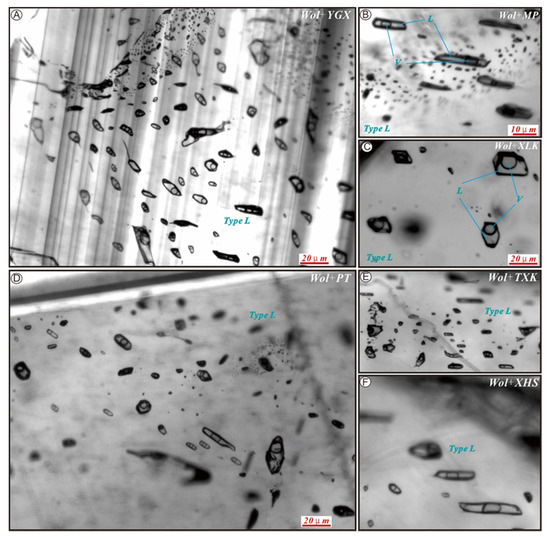 Photomicrograph of representative fluid inclusions captured in wolframite from wolframite-quartz vein-type tungsten deposits in South China. Pictures show typical two-phase liquid-rich fluid inclusion assemblages in wolframite from the Yaogangxian (A), Maoping (B), Xingluokeng (C), Piaotang (D), Taoxikeng (E) and Xihuashan (F) tungsten deposits, respectively. Abbreviations: Wol—Wolframite YGX—Yaogangxian; MP—Maoping; XLK—Xingluokeng; PT—Piaotang; TXK—Taoxikeng; XHS—Xihuashan; L—liquid; V—vapor.