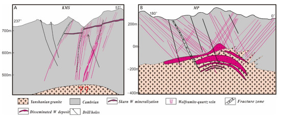 Cross sections of the Huangsha and (A) Xushan (B) tungsten deposits, both showing the spatial relationship between veins, greisen and granitic intrusions (modified after [23]).